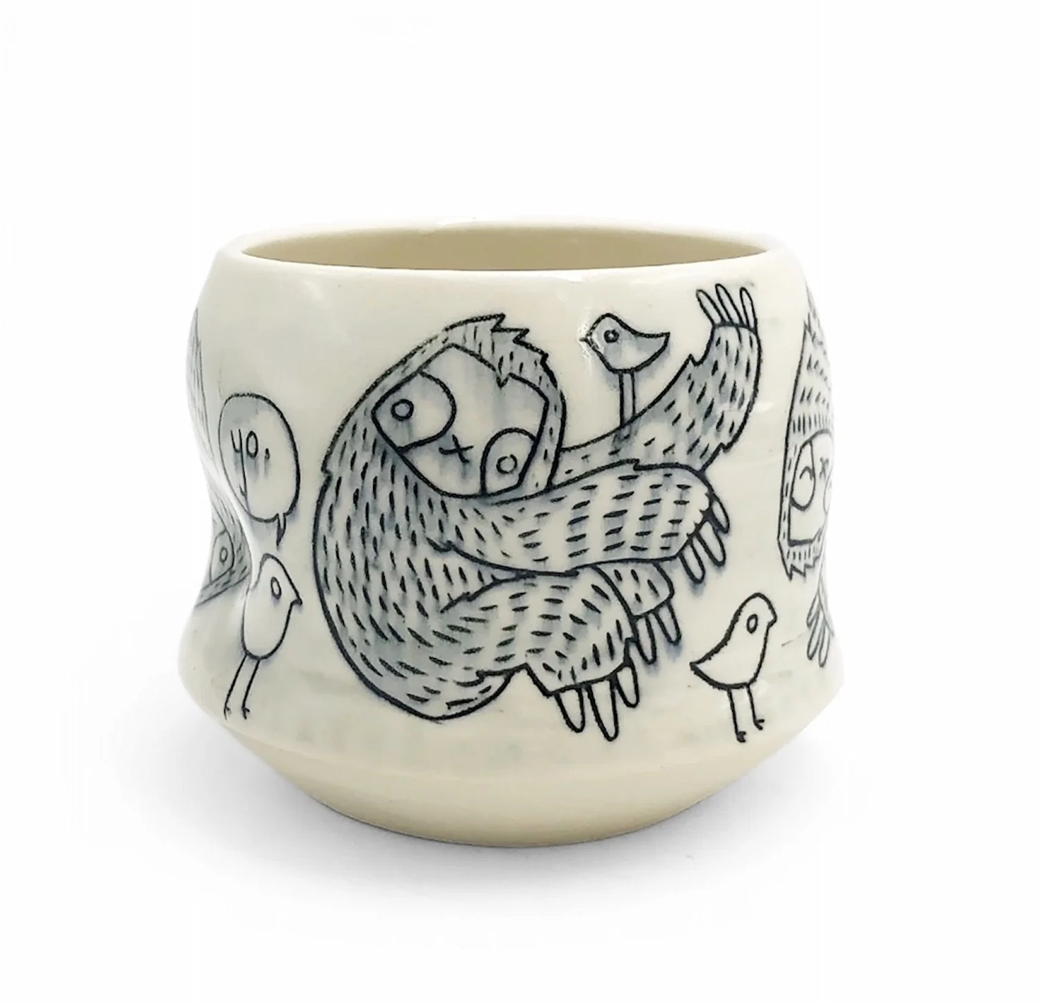 Tricia has had a lifelong love of both clay and illustration, and she marries the two in her functional and sculptural work. As a primarily self-taught artist, she embraces an aesthetic that is informed by the joy of doodling on a fresh sheet of paper and the satisfaction of a voluptuously curving form. Schmidt's animals and figures are often self-referential, but universal enough to appeal to a larger audience using her favorite motifs: ambivalent sloths, playful cats, industrious bunnies, malevolent squirrels, & introspective women.